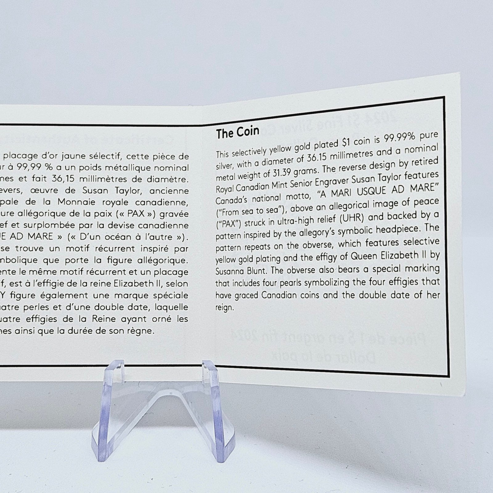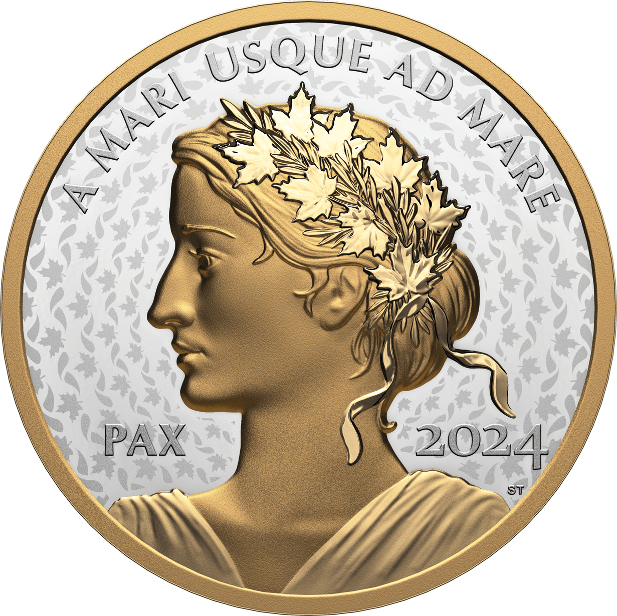 Canada’s 2024 Peace themed silver dollar features an intricately engraved female personification of Peace selectively plated with a layer of fine gold. The Latin inscription “Pax” denotes the Roman goddess of peace, and serves as a reminder of Canada’s past, present, and future commitment to seeking peace, stability, and a more secure international order.
