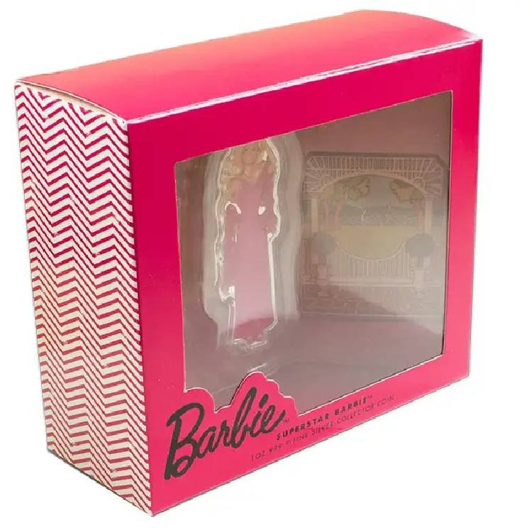 Celebrate the iconic 1977 Superstar Barbie with this limited edition pure silver coin. A specially-shaped design captures her famous pose and silhouette, while its colorization portrays Superstar Barbie’s photo-worthy smile, glamorous magenta gown and gemstone accessories with stunning accuracy. The coin includes a protective capsule and posing base, as well as a display box that replicates Superstar Barbie’s fashion photo studio and dressing room. Don’t miss out on the opportunity to own a piece of Barbie history!
