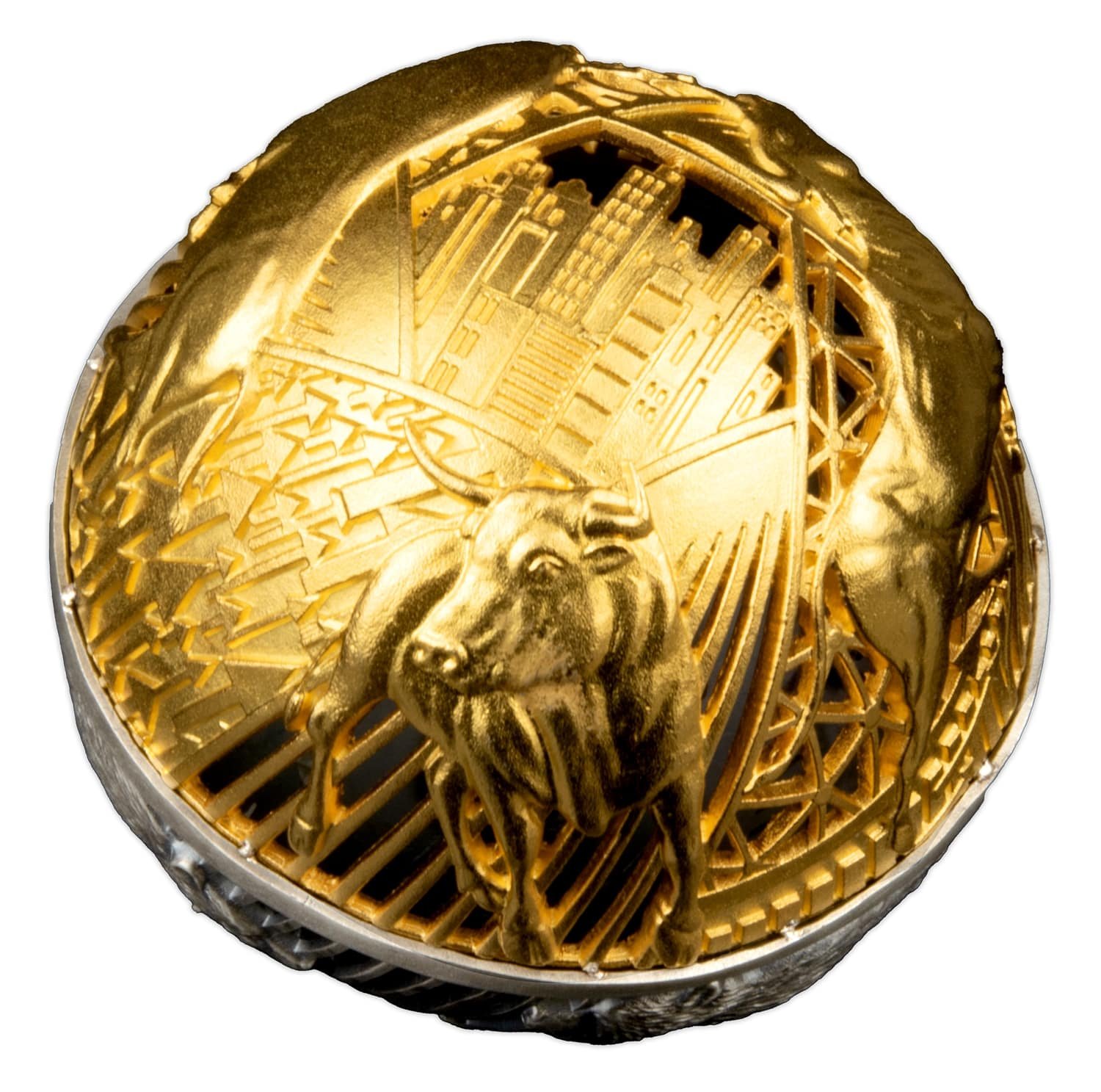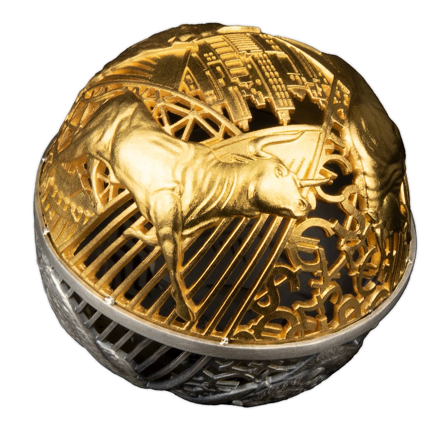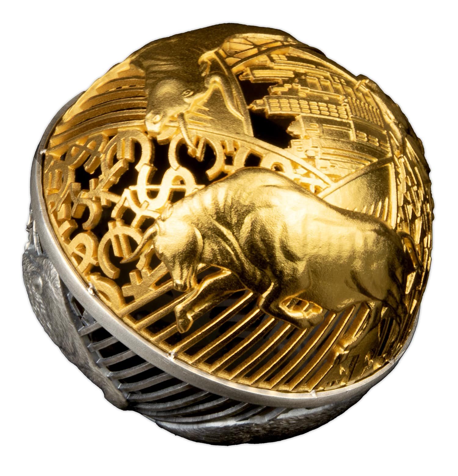 2 oz Silver Bull & Bear Opposites Attract Filigree Cut Out Spherical Coin 2022