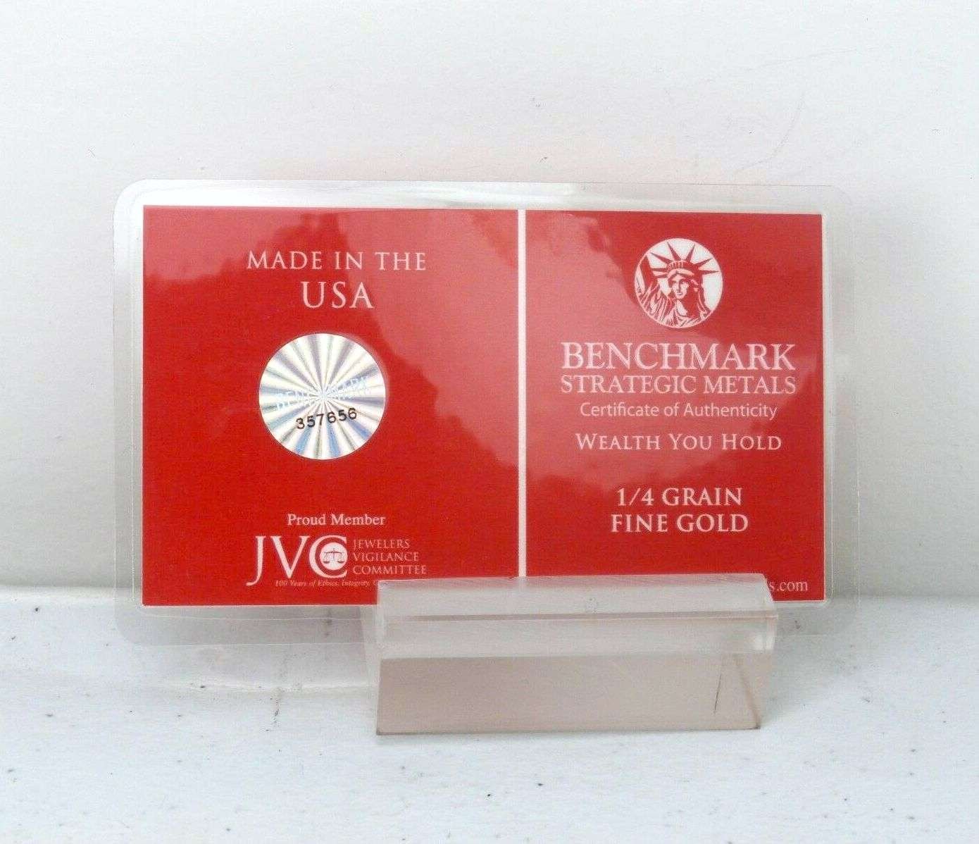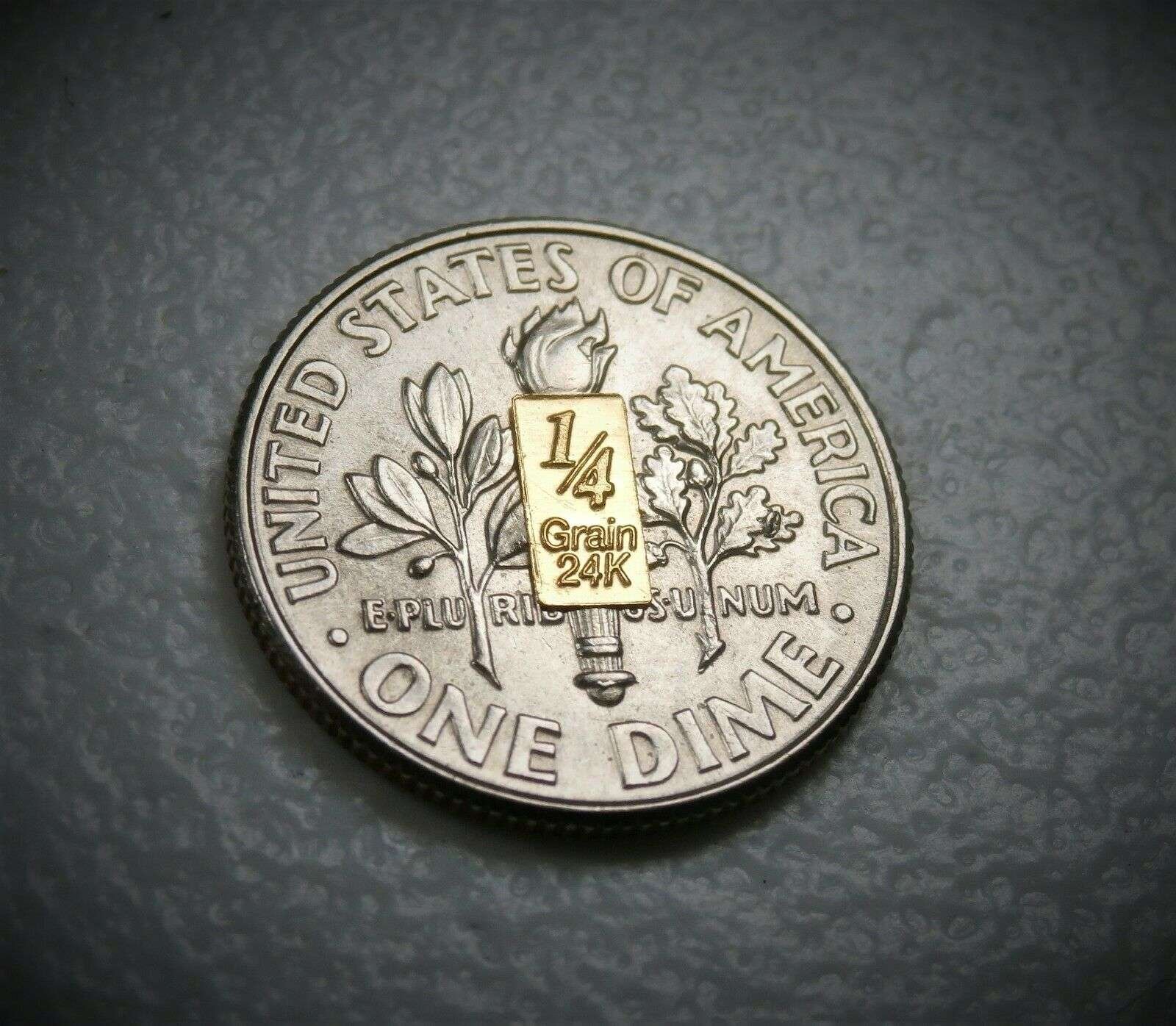 This lovely 1/4 grain (NOT GRAM) bar is pure 24 carat gold! (not alloyed, not mixed metal, not plated – but pure .999 GOLD). This pure gold bar measures 3mm X 6mm, or if you prefer decimal, approx .125in X .250in, OR if you prefer fractional, approx. 1/8 inch by 1/4 inch. The pictures are enlarged to show detail of the strike.